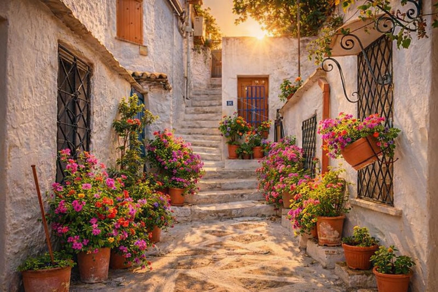 - Integrated Flora: Bougainvillea, jasmine, basil, and succulents in ceramic pots are part of the composition, softening the sharp lines of the buildings.