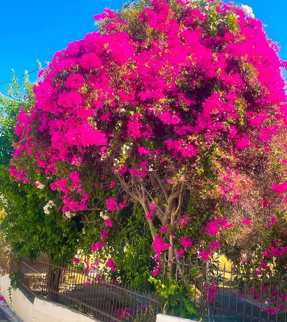 Bougainvillea (gr. βουκαμβίλια), znana także jako kącicierń, pochodzi z Ameryki Południowej. Doskonale rośnie jednak również w klimacie śródziemnomorskim, gdzie obficie kwitnie, pokrywając ogromne obszary murów i ogrodzeń lokalnych domostw. Bougainvillea jest nieodłącznym elementem krajobrazu greckich miast i wiosek, jej jaskrawe kwiaty o intensywnych różnych kolorach, takich jak czerwony, różowy, fioletowy i biały, ozdabiają ulice, tarasy i dziedzińce, dodając urok i koloru lokalnym architekturom.