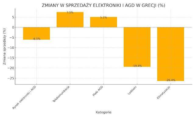 Choć rynek elektroniki w Grecji osiągnął wartość około 2,1 miliarda euro, sprzedaż spada zarówno pod względem wartości (-6,1%), jak i liczby sprzedanych jednostek (-1,9%). Szczególnie dotkliwy dla greckiego biznesu jest spadek sprzedaży większych urządzeń AGD, takich jak lodówki (-19,4%) czy klimatyzacje (-26,4%). Konsumenci wybierają te zakupy ostrożniej, a zakup dużych sprzętów często odkładają na później.