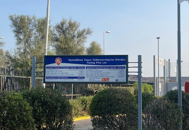 Dostęp do mariny jest możliwy również samochodem, korzystając z Autostrady Krajowej E75, prowadzącej do Al. Posejdonos, oraz z Al. Syngrou, która również łączy się z Al. Posejdonos. Przed mariną dostępne są zarówno bezpłatne, jak i płatne miejsca parkingowe (ceny na zdjęciu poniżej).