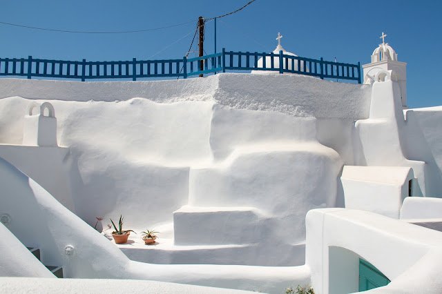 Informacje: Aby dotrzeć do kościółka Proroka Eliasza, należy skręcić w lewo przy tawernie Iris na drodze do Oia (Οία). Kościółek oferuje widok na kalderę oraz wschodnią część wyspy.