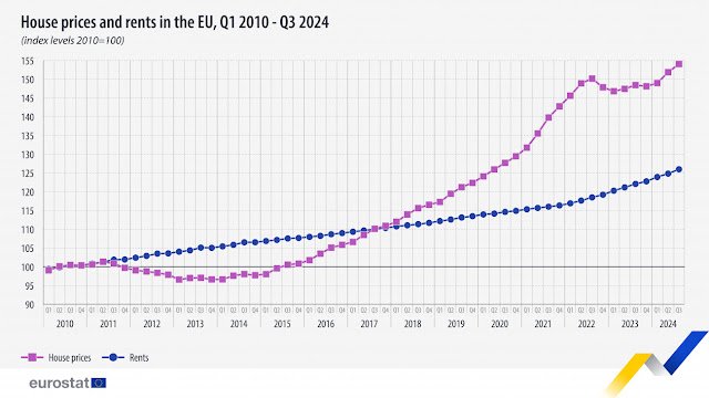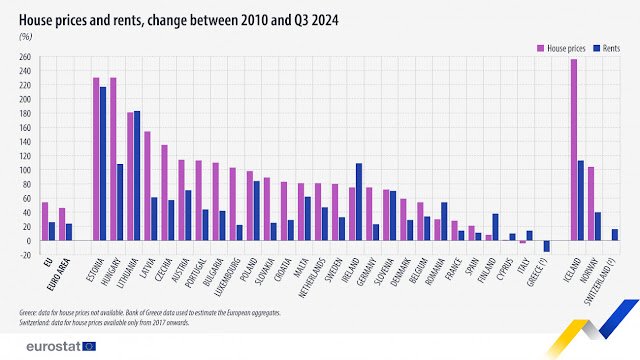 Porównując Grecję z innymi krajami UE, wyraźnie widać, że jej rynek nieruchomości wyróżnia się na tle reszty Europy. Od 2010 roku ceny mieszkań w Unii Europejskiej wzrosły średnio o 54,1%, a czynsze o 26%. W tym samym czasie w Grecji czynsze realnie (po uwzględnieniu inflacji) spadły o 16%, co czyni ten kraj jedynym w UE, który odnotował taki spadek. Wynikało to z głębokiego kryzysu gospodarczego, który wówczas ograniczył siłę nabywczą Greków oraz zmniejszył popyt na wynajem mieszkań.
