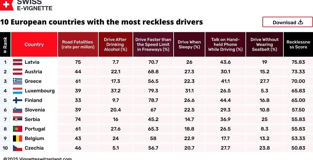 Szwajcarzy oparli swój ranking na sześciu kluczowych wskaźnikach: liczbie śmiertelnych wypadków drogowych na milion mieszkańców, przekraczaniu prędkości, jeździe po alkoholu lub w stanie zmęczenia, niestosowaniu pasów bezpieczeństwa oraz używaniu telefonu podczas jazdy. Wynik Grecji? 70,00 punktów, co daje jej zaszczytne trzecie miejsce… od końca.