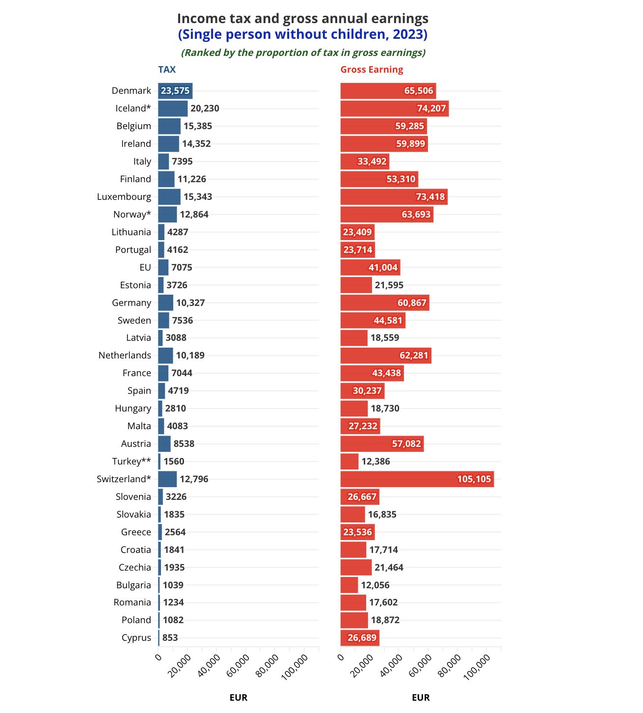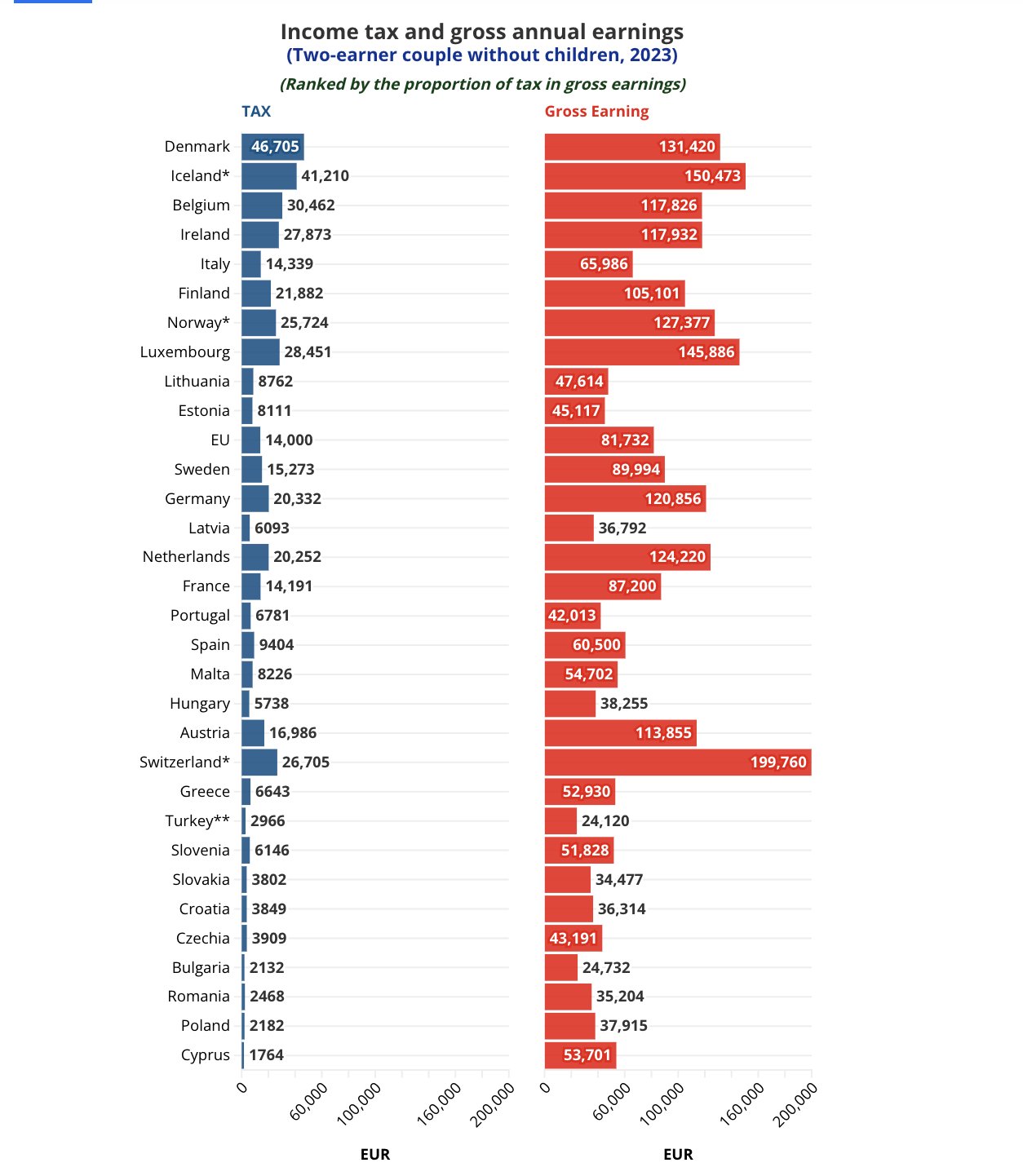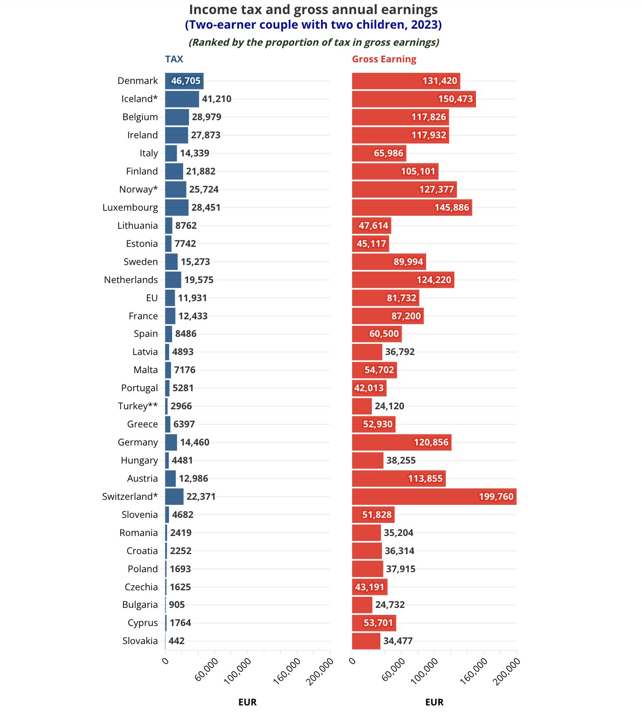 - Dania – wynagrodzenie 131 420 euro, podatek 46 705 euro (35,5%), dochód netto 84 715 euro.
