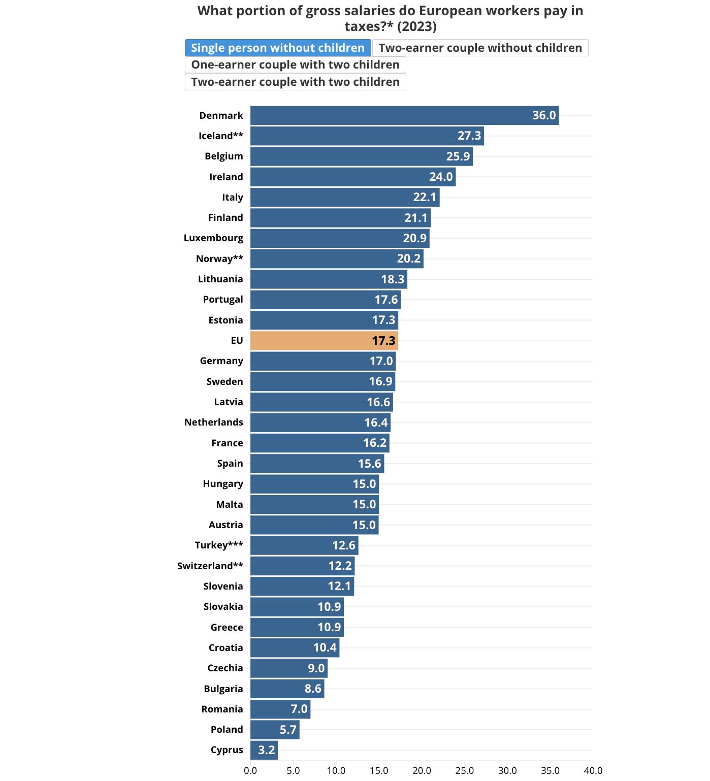 - Cypr – bezkonkurencyjny lider w kategorii najniższego opodatkowania. Przy średnich zarobkach 26 689 euro, singiel płaci tylko 853 euro podatku (3,2%), co oznacza, że zostaje mu 25 836 euro – prawie całość wynagrodzenia brutto!