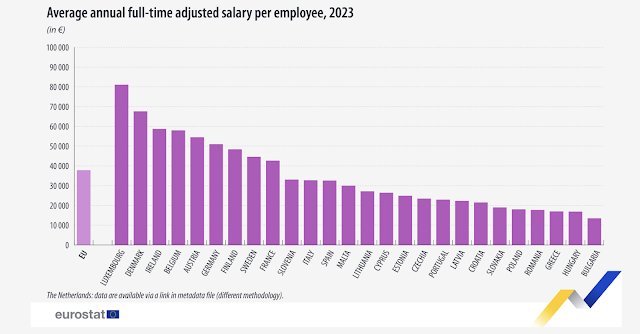 Kraje Europy Zachodniej i Północnej, takie jak Luksemburg, Belgia czy Niemcy, dominują w rankingach wynagrodzeń zarówno w wartościach nominalnych, jak i w PPS. W Luksemburgu średnie wynagrodzenie w PPS wynosi 53 745, podczas gdy w Belgii, Danii i Niemczech wynosi ponad 45 000 PPS. Kraje południowe, takie jak Hiszpania czy Włochy, wypadają gorzej, ale ich wyniki nadal są znacznie wyższe niż w Grecji – odpowiednio 35 774 PPS i 33 723 PPS.