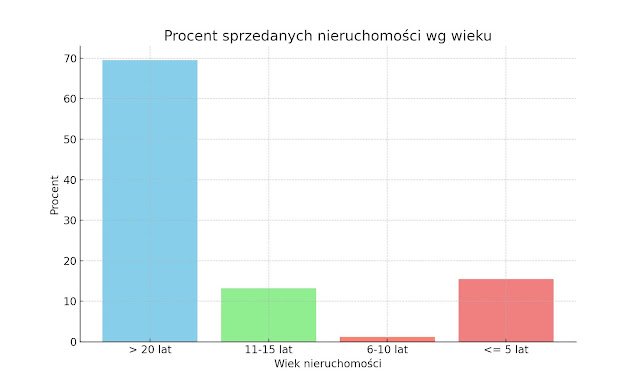Analiza wieku sprzedanych nieruchomości pokazuje, że kupujący preferują starsze budynki. Aż 69,5% nabywców wybrało mieszkania mające ponad 20 lat, co pozwalało im na zakup po bardziej konkurencyjnych cenach. Nowe nieruchomości, do 5 lat, stanowiły 15,5% sprzedaży. Nieruchomości w przedziale wiekowym 11-15 lat stanowiły 13,2%, natomiast te mające od 6 do 10 lat – jedynie 1,2%.