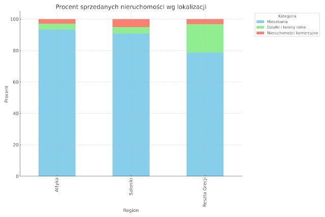 W regionie Attyka, obejmującym między innymi Ateny, dominacja mieszkań była jeszcze bardziej wyraźna – stanowiły one 93,3% wszystkich transakcji. Działki i tereny rolnicze stanowiły 3,8%, a nieruchomości komercyjne jedynie 2,9%.