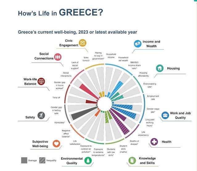 OECD, na podstawie 80 różnych wskaźników, stworzył „koło dobrobytu”, które pokazuje, jak Grecja radzi sobie w 11 kluczowych aspektach życia. Wśród nich znajdują się dochody, mieszkalnictwo, zdrowie, bezpieczeństwo, środowisko, a także relacje społeczne i równowaga między pracą a życiem prywatnym. Niestety, Grecja wypada poniżej średniej w większości tych kategorii. Problemy, takie jak trudności ekonomiczne, przeludnione mieszkania, nierówności płacowe, długie godziny pracy i niska frekwencja wyborcza, są codziennymi wyzwaniami Greków. Jedynym wyjątkiem są relacje społeczne – Grecy pozostają otwartym i towarzyskim narodem, co wciąż jest ich mocną stroną.