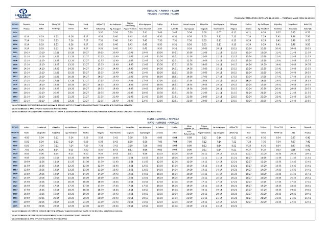 Rozkład jazdy z Koryntu do Pireusu oraz z Pireusu do Kiato.