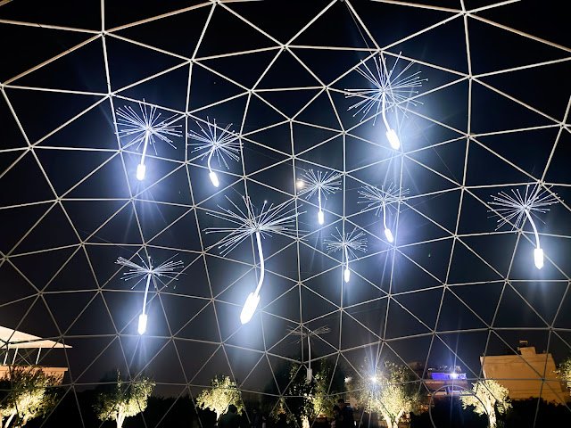 Dziesięć ogromnych „nasion mniszka”, które sprawiają wrażenie „oddychających” światłem - metafora uwalniania marzeń. -