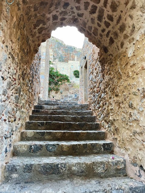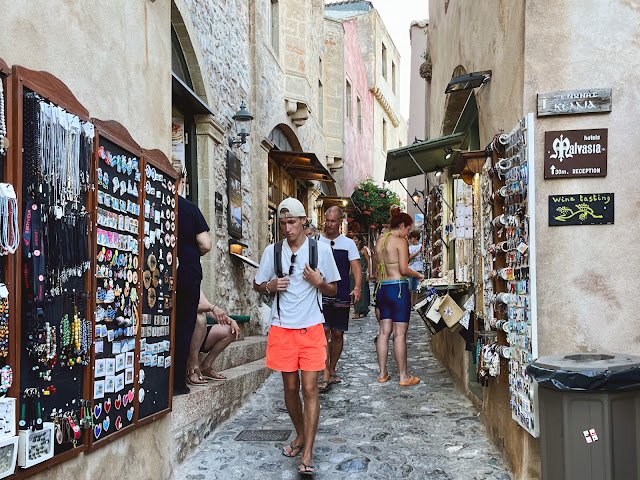 Przechadzka po wąskich uliczkach Monemwasi to niczym podróż w czasie, przenosząca Was w czasy średniowiecza. Kamienne brukowe ścieżki, kolorowe drzwi i okiennice, zdobienia na fasadach budynków - wszystko to zdecydowanie tworzy unikalny nastrój. Podczas pobytu tam, warto odwiedzić lokalne sklepy z rękodziełem, gdzie sprzedawane są na przykład ręcznie wyrabiana galanteria skórzana.