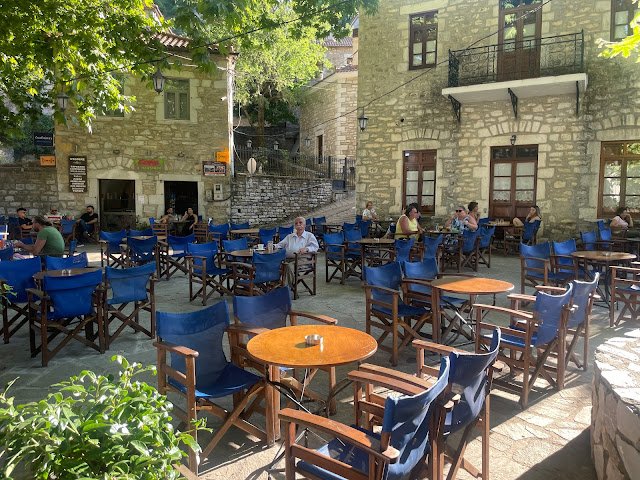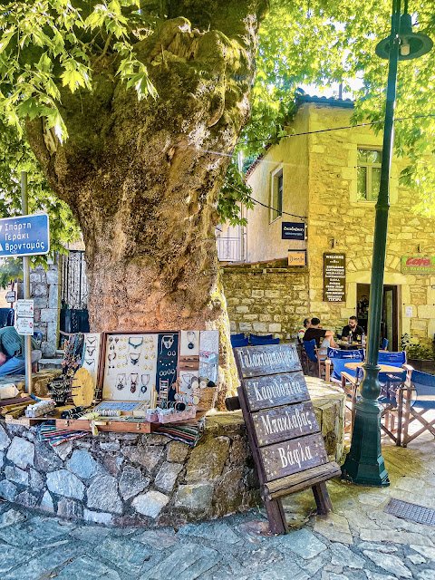 Codzienne życie wioski toczy się zazwyczaj wokół dużego centralnie usytuowanego placu, który zdobią imponujące drzewa tzw. platania. Ich wiek został dokładnie udokumentowany, ponieważ wiadomo, że zostały ona zasadzone w roku 1883. Na placu dominuje kościół pod wezwaniem "Agoi Anargyroi" (gr. Άγιοι Ανάργυροι), który jest głównym miejscem kultu. Na tyle kościoła znajdują się trzy źródła zwane "Lwicami" - to tradycyjne źródełka, wypływające z krystalicznych wód tego obszaru.