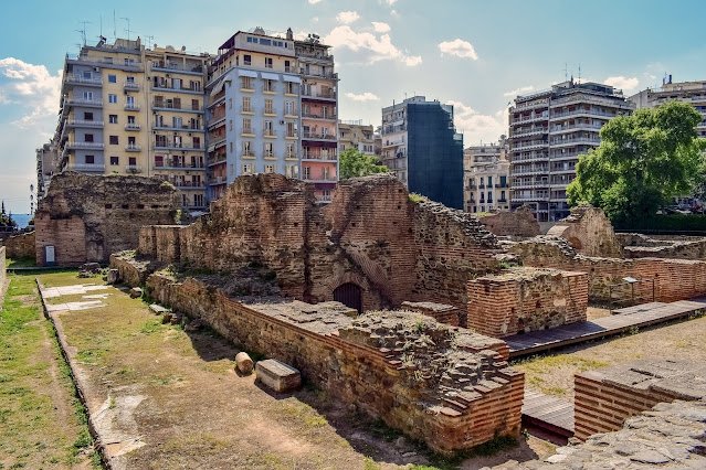 Podążając dalej autobusem ulicami Agios Nikolaos i Kassandrou w kierunku morza, można zobaczyć po prawej stronie Starożytną Agorę stanowiące w czasach rzymskich prawdziwe centrum miasta gdzie skupiało się całe życie społeczne, religijne i handlowe. Nieopodal znajdują się również znaczące obiekty architektury osmańskiej dawnego Imperium Osmańskiego, takie jak Yeni Hamam z końca XVI wieku oraz Alatza Imaret z 1484 roku.
