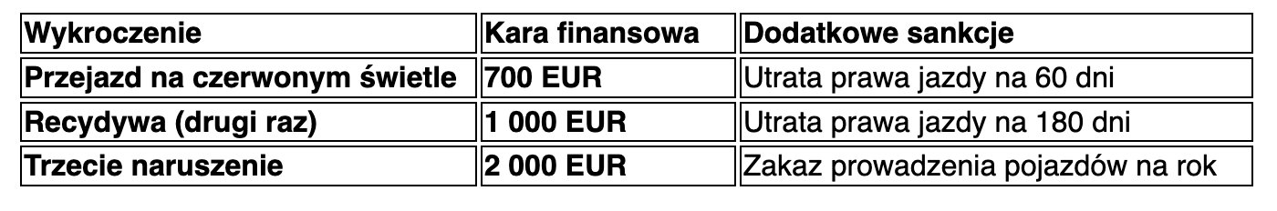 Uwaga! Jeśli wykroczenie doprowadzi do wypadku drogowego, grzywna może wzrosnąć do 8 000 EUR, a prawo jazdy może zostać odebrane nawet na 4 lata, niezależnie od sankcji karnych.