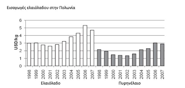 Σύμφωνα με τα στατιστικά στοιχεία (GUS), το 2005 η εισαγωγή του πυρηνέλαιου από την Ελλάδα μειώθηκε σημαντικά — μείωση των εισαγωγών κατά 45% ως προς την ποσότητα σε σύγκριση με το προηγούμενο έτος — με αποτέλεσμα η Τσεχία να γίνει ένας από τους κύριους προμηθευτές της Πολωνίας.
