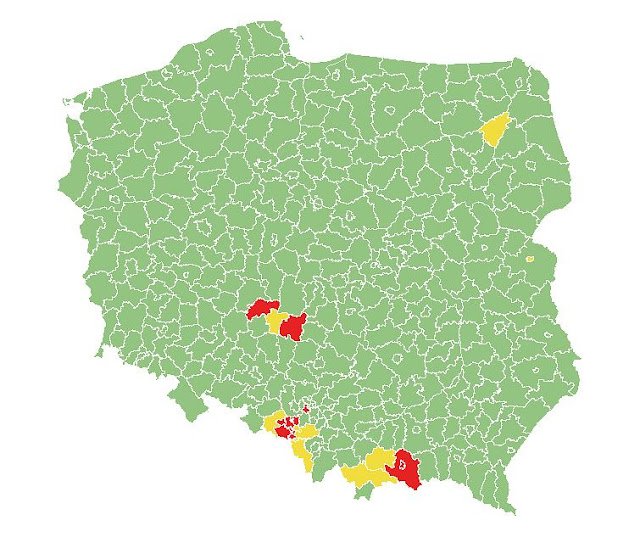 Η Πολωνία εισήγαγε περιορισμούς με βάση τον αριθμό κρουσμάτων ανά περιφέρεια. Οι περιοχές με τα περισσότερα κρούσματα υπόκεινται σε πρόσθετους περιορισμούς όσον αφορά τις εκθέσεις και τα συνέδρια, τις αθλητικές και τις πολιτιστικές εκδηλώσεις, τη γαστρονομία, τα σανατόρια, τους γάμους και τις μεταφορές. Οι περιοχές αυτές επισημαίνονται με κίτρινο και κόκκινο χρώμα, ενώ η υπόλοιπη Πολωνία επισημαίνεται με πράσινο χρώμα.