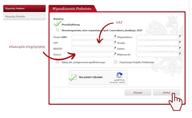 Δυστυχώς, το Πολωνικό Μητρώο Επιχειρήσεων είναι διαθέσιμο μόνο στην πολωνική γλώσσα.