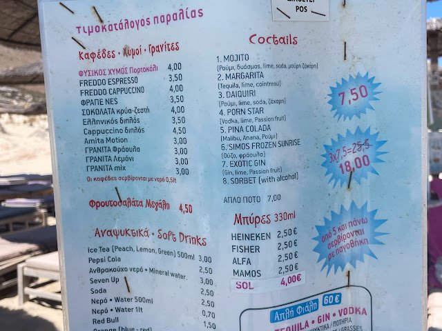 Na plaży w miejscowym beach-barze można skorzystać z leżaków i parasola. Wynajęcie zestawu z dwoma leżakami i parasolem kosztuje od 15 EUR do 25 EUR, w zależności od jakości leżaka! W Grecji powszechną praktyką jest to, że drewniane leżaki są droższe niż standardowe aluminiowe. Poniżej znajdują się aktualne ceny kaw i drinków, które można zamówić w barze na plaży Simos. W porównaniu do cen leżaków, są one całkiem przystępne.
